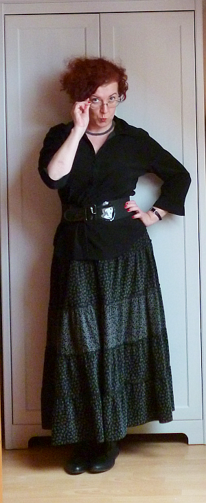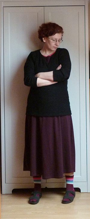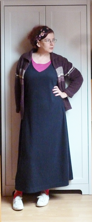 (Nagyjából most jutottam oda, hogy meg kell oldanom a dilemmát: számít-e a felsőruházat annyira, hogy idefotózzam azt is? Amikor kimegyek a házból, a fenti holmikra még rádobálok egy piros sálat meg egy sötétszürke átmeneti kabátot, de van-e abban annyi érdekesség, hogy azt is lefotózzam? A télikabátjaim ráadásul, amiknek egyre jobban közelg a szezonja, mind feketék, plusz egy szürke meg  egy tevebarna, na meg egy átalakításra érett piros. Ha azokat tekintem ezt-vettem-fel-ma holminak, viszlát változatosság, ráadásul nem fog látszani az sem, mit hordok alattuk.