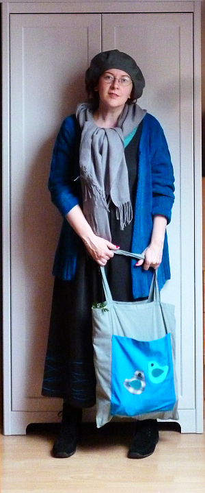 A szombati piachoz a legszebb csámpás zsenília kardigánomba burkolóztam bele, aminek olyan remekül alakítottam ki a nyakkivágását, hogy muszáj sálat hordanom hozzá, amíg ki nem találok valami más megoldást a problémára. A kardigánt már hordtam amúgy valamelyik szerdán: akkor a vaku miatt nem látszott eléggé, milyen ordenáré pávakék színe van. (Most sem sikerült tökéletesen visszaadni, de azért ez már közelebb van a valósághoz.) A kötényruha is volt már rajtam, de persze nem a kardigánnal együtt, pedig jól látható, hogy ezek ugyanannak a merényletnek az eredményei: a kardigán átalakítása során lebontott fonalból készültek a kötényruha alján a hullámok.
