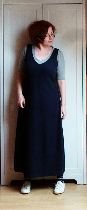 Újabb átalakításra érett, csak otthonra hordható szürke póló (már a második – előbb-utóbb ezeknek is neki kell ugranom), na meg a megbízható kék kötényruhám.