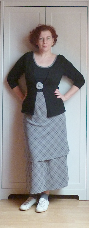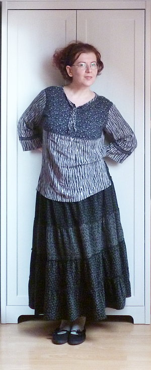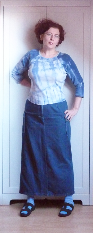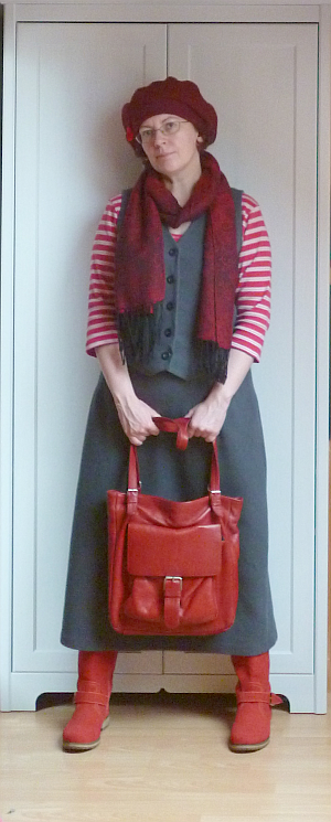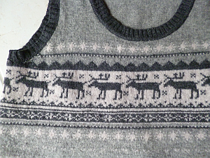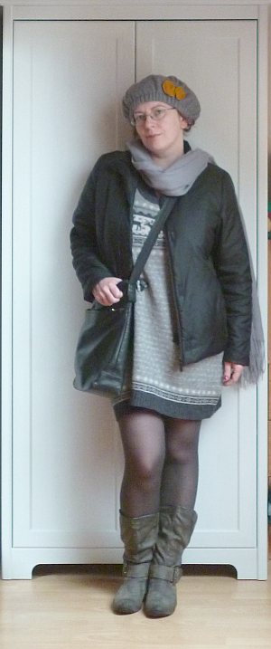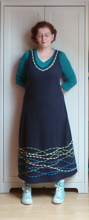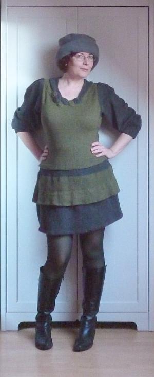 Az alábbi zöld-szürke szörnyikét két döglött férfipulóverből barkácsoltam össze több mint három évvel ezelőtt. Ez volt az első ilyen jellegű kísérletem, ez látszik is rajta. Nagyon sokat tanultam közben, de a végeredménnyel nem vagyok valami elégedett. Túl rövid, túl fodrocskás, túl széles a válla, és még sorolhatnám. A legnagyobb gond viszont az, hogy remek szúrós gyapjúból van.