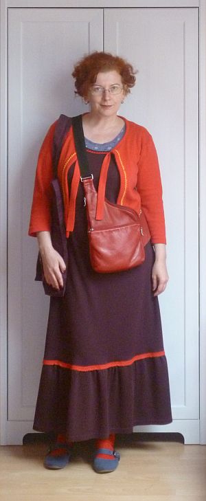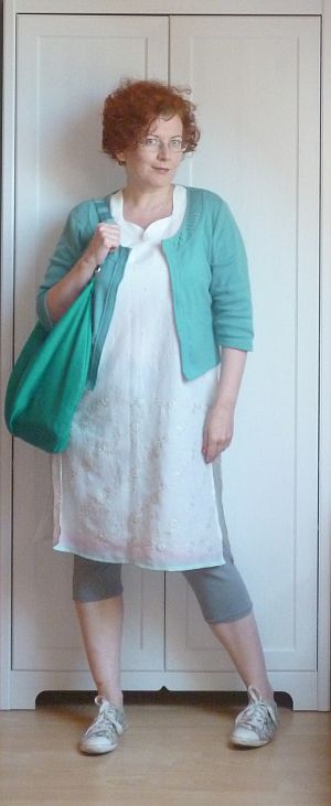 (SK: a kötényruha, pólóból-kardigán és a szatyor.)