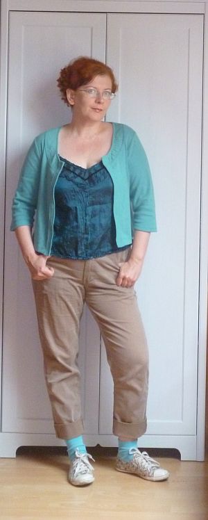 (SK: a kardigánt már láthattátok például itt – igaz, akkor még nem kardigán volt. És a nadrág sem ebben a formában kezdte a karrierjét.)