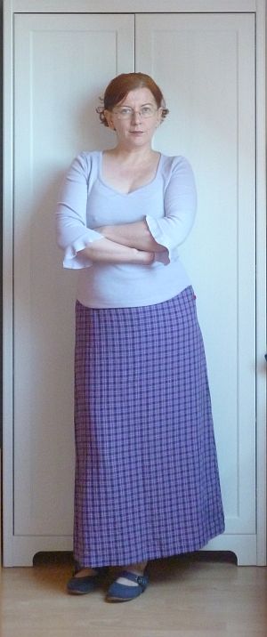 Itt van például a mai nap errefelé eddig még ismeretlen két szereplője: a szoknya öreg, mint az ország útja, derékban kicsikét szorosabb is a kelleténél, a pólót meg sose hordtam sokat. Vannak ruhadarabok, amelyeket megvesz az ember, aztán csak úgy kuksolnak egy-két évtizedig a komódban, és nem csinálnak ott semmit – nos, ez a blúz is olyan. Otto katalógus cirka 2001, kettőt vesz, kevesebbet fizet, a fekete, amire eredetileg ácsingóztam, már elfogyott. Amióta megvettem, azóta nem tudtam megszeretni a bús halványlila színét, a fodrocskás ujját meg a roppant előnytelen aljamegoldását sem. Valószínűleg mégis leginkább a színével van baj, vettem belőle sötétlilát is, azt valamicskével gyakrabban veszem fel. Valamicskével. Valószínűleg át kéne szabnom a sötétebbiket, ezt meg elröptetni a naplementébe.