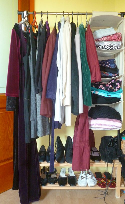 És, akár hiszitek, akár nem, ez még mindig nem az összes. A télikabátokat meg a vidéki esküvőre való nyári kalapomat elő sem vettem a seregszemléhez, és a fotó elkészítése után találtam még egy bársonyruhát. Zöldet. Nem csoda, hogy megfeledkeztem róla, már tíz éve nem volt rajtam.