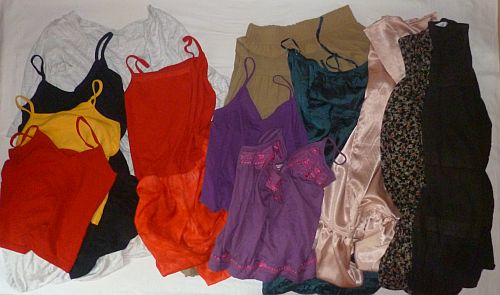 2. Szintén nem számít olyasmi, amit nem veszek fel önmagában – ilyenek például az alsószoknyák, alsóruhák vagy a spagettipántos kombinétopok, amelyekhez mindig kellett valamilyen ing vagy kardigán. Mivel persze az én öltözködésemmel bármikor dönthetnék úgy, hogy “és mostantól ez alsóruhának számít”, itt egy kép arról, konkrétan mikre gondolok. Van közöttük olyan is, amit korábban önmagában is felvettem (a sokat látott sárga szoknya, az öreganyóka-mintás fodros szoknya vagy a top+anyagdarab piros izé, vagy az a fekete szoknya, ami tavaly szeptember elsején volt rajtam, de már akkor is elég jól elbújtatva). Na hát mostantól ezek alsószoknyának-alsóruhának számítanak, uff, de év közben már nem változtathatok a listájukon, szintén uff. Igen, valóban elég sok holmi ez, összesen tizenkét darab, de becsületszóra megígérem, hogy havonta maximum hármat használok fel belőlük.