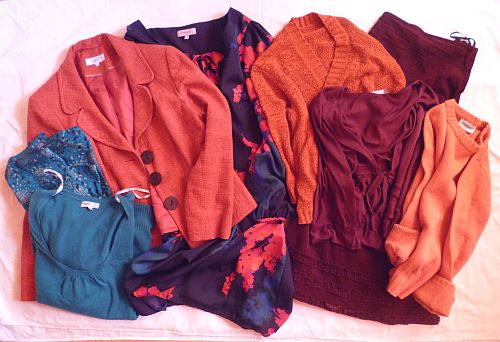Egy blézer, három felső, egy kardigán (ezt speciel nem kilós, hanem darabáras turkálóból vettem, meg is dobta rendesen a bevásárlási összeget), egy pulóver, egy ruha, valamint egy szoknya, ami jelen pillanatában 22-es méretű, miközben én jelen pillanatomban 12/14-es méretű vagyok, de megoldjuk. (Mármint úgy oldjuk majd meg, hogy a szoknya lesz kisebb, nem pedig én nagyobb.) A színek valamiért nem jöttek ki jól, próbáltam trükközni a képpel, de attól csak egyre rosszabb lett, na mindegy. Úgyis látjátok az összes holmit előbb-utóbb.