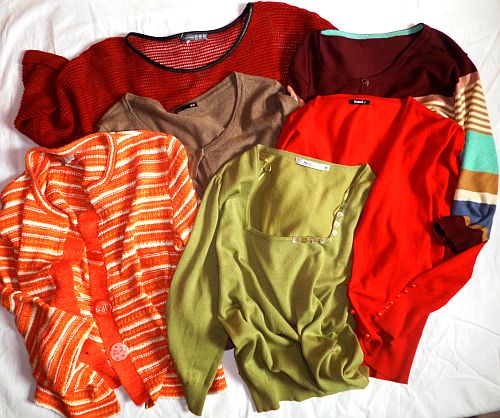 A krumplibarna kardigán biztosan nem marad ebben a formában, a piros se, a zöld pulcsiról mielőbb leoperálom a funkciótlan kis gyöngyházgombocskákat, a csíkos-narancsnál meg még nem tudom, érdemes-e megtartanom a gombolódós részét, lehet, hogy az is repülni fog.