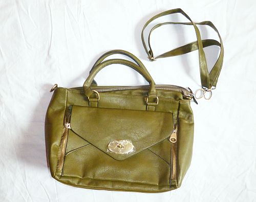 Na most én általában nem veszek műbőr táskákat, a táskáim nagyrészt vagy turkálós vászontáskák, vagy pedig a Fisitől vannak (disclaimer: nem fizetnek nekem a reklámért, meg egyébként is frissíthetnének már a honlapjukon), a műbőrrel szemben erős averzióim vannak. Egy műbőr táska rendszerint túl drága a műbőrségéhez képest, meg túlságosan tele van firlefanccal ahhoz, hogy hazavigyem, még akár a kínai bótból is. Ez viszont mégis olyan hangosan süvöltözött felém a tartályból, hogy nem hagyhattam ott. Szép masszív darab, kevés rajta a csingilingi, ráadásul zöld!!!, és mint a mellékelt ábra mutatja, még sose volt használatban – látjátok a csatján a védőfóliát? Úgyhogy, bevallom, tulajdonképpen emiatt a táska miatt mentem vissza leakasztani a fenti zöld pulcsit is, rút matchy-matchy váz aki vagyok.