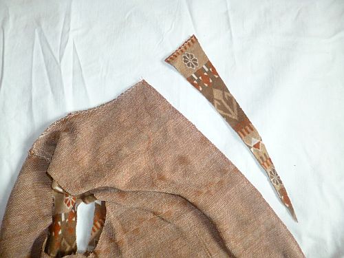 Mivel ahhoz az időponthoz képest, amikor négy vagy öt évvel ezelőtt megvarrtam őkelmét, jelentősen megszaporodtak a ruhatáramban a narancssárga darabok, előkotortam néhány megmaradt narancs-rozsda színű pólóanyag-cafatot. Arra egyik darabka sem lett volna elég, hogy bármi önállóan is hordható holmit szerkintsek össze belőlük, de a jelenlegi céljaimra tökéletesen elég volt ez is. Egy öreg, jól bevált Burda-szabásminta alapján legyártottam belőle az új ruhaujjakat, aztán beillesztettem a helyükre.