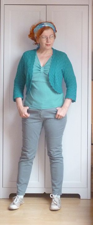 Gyanítom, ennek a pulcsinak muszáj lesz megrövidítenem a derekát, egyszerűen semmivel se hajlandó jól állni.