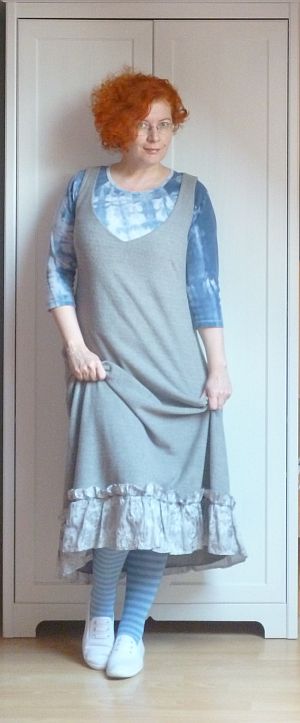 Átalakítani valamit azért érdemes, mert az ember lányának ettől hirtelen lesz egy új és hordható holmija, ráadásul nem is kell tovább tologatni azzal, hogy “majd megcsinálom, valamikor, nemsokára”. Csak ezt kell észben tartanom, és akkor szép lassan fogyatkozni fog az “ezzel is kéne kezdeni valamit” kupac – a továbbiakban megpróbálok legalább heti eggyel megbirkózni, hátha menni fog. Ezzel a mostanival amúgy még mindig nem vagyok teljesen elégedett; még az is lehet, hogy egyszer majd a továbbiakban egy hosszabb ruha lesz belőle (valahol még megvan az eredeti aljáról levágott darab, én jóformán semmit sem dobok ki, ami tenyérnyinél nagyobb anyag), esetleg blúz, ha úgy látom, annak venném nagyobb hasznát, de mindenesetre végre fel tudom venni, ez is valami.