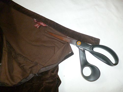 Ezután következett az a pillanat, amikor egy, a készleten lévő rugalmas kordanyagból levágtam egy három centi széles csíkot, amivel a derékpántot akartam megoldani. (Azért rugalmasból, mert feltehetőleg már nem leszek soványabb, kövérebb viszont még bármikor lehetek.) Ráillesztettem a derékpántra, így ni (a kilógó rész fontos, majd meglátjátok):
