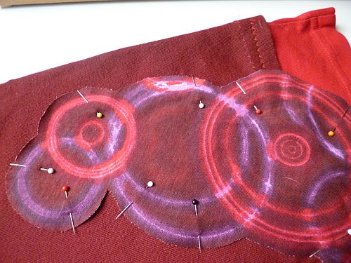 Az ujj anyagából kivágott darabot ráillesztettem a pólóra alul-baloldalt a nekem leginkább szimpatikus helyen, odagombostűztem,