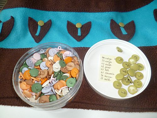 Mára lehiggadtam annyira, hogy nem akartam mindent ráhordani szegény ruhára, csak egy kicsit. A gombokkal kezdtem, az eredeti barnák helyett világoszöldeket varrva fel a tulipánok bibéjéül – ezek is abból a négyeurós csomagból valók, amelyet egy tamperei turkálóban vetettem meg magamnak a Repülő Kutatóval. A gombjaimat amúgy kiürült avonos hajbalzsam-dobozokban tartom, és, mint az alábbi képen látható, a dobozfedélen van a lista, hogy melyik színből hány darab található a készletben. (Nem, egy kicsit sem vagyok controlfreak. Ti nem vezettek nyilvántartást a gombjaitokról? Cöcö.)