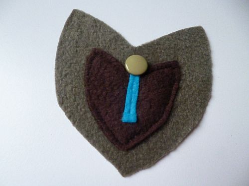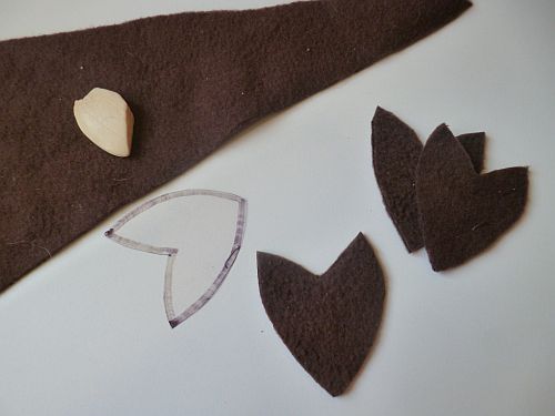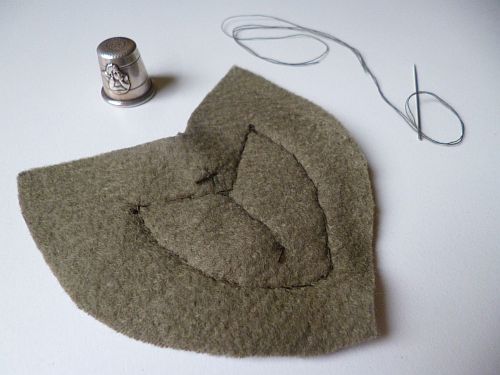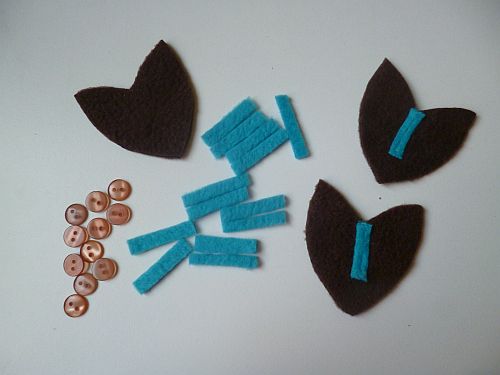 Akárcsak a fekete-kék kötényruha esetében, ezekhez a tulipánokhoz is kivágtam a közepükre szánt kis kék csíkokat (és előkészítettem a bibékhez egy csomó kis barna gombot). A csíkocskákat egyenes öltéssel varrtam fel a tulipánok közepére, így ni.