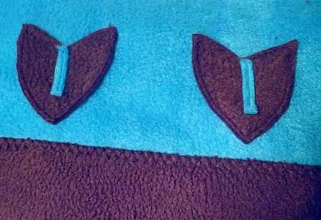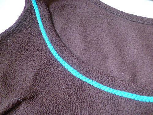 Egy fél centi széles csíkot is kivágtam a kék polárból, ezt felvarrtam cikcakkal a kötényruha nyakkivágására.