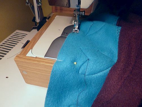 Rágombostűztem a tulipánokat a kék csíkra, és egyenes öltéssel felvarrtam, a szélüktől pár milliméterre vezetve a varrógéptűt. (Ha vastagabb anyagokból készült rátétekkel dolgozom, szeretem ezt a technikát alkalmazni a cikcakkvarrás helyett, így sokkal plasztikusabb lesz a végeredmény.)