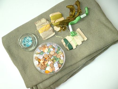 Úgyhogy dühömben összehordtam egy kupacba egy csomó kincsecskét, amiről persze már akkor tudtam, hogy fele se kerül bele a kész projektbe, de ah, tobzódás, bőség, földi hívságok. Mint azt szívesen szoktam hangoztatni, a zöld a remény színe meg a libafosé, úgyhogy gyerünk elő zöldek. Itt ebben a kuplerájban természetesen van zöld poláranyag is (egész pontosan négyféle zöld poláranyag, ha tudni akarjátok). Ja, meg gombok is, miért éppen zöld gombok ne lennének. Ó, és hímzőcérna. Rohadt sok hímzőcérna.