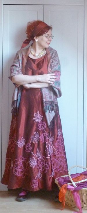 A ruha alját két alkalmatos méretű téglalapból vágtam ki, és mindenféle hólokkal meg hajtásokkal igazítottam hozzá a felsőrészhez. Az elejére varrtam kettő rátett zsebet is tilupámokkal,