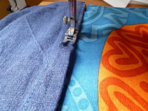 Tecciklátni, mintha csak könyvborítót ácsolna az ember. Utána már csak merevítő kell bele, például egy régi keményfedelű mappából méretre vágva, aztán belebújtatni, és széles cikcakkal lezárni a nyitott széleket. (Cérnát is cseréltem, most már alul-felül szürkére.)