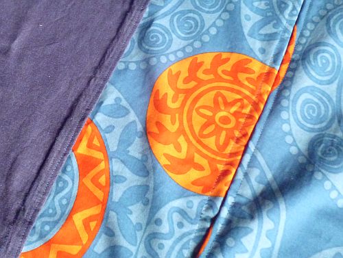 Kivéve azon az oldalon, ahol ugyebár az ember átvarrna cikcakkal a gyöngyörűséges molyrágcsa-takaró tallérain. Ha már ennyit tököltem vele eddig, nem hagyhatom veszendőbe menni. Ott bizony kézzel kell dolgozni, de ha lúd, akkor legyen döglött, és legyen elütő színű az a pelenkaöltés.