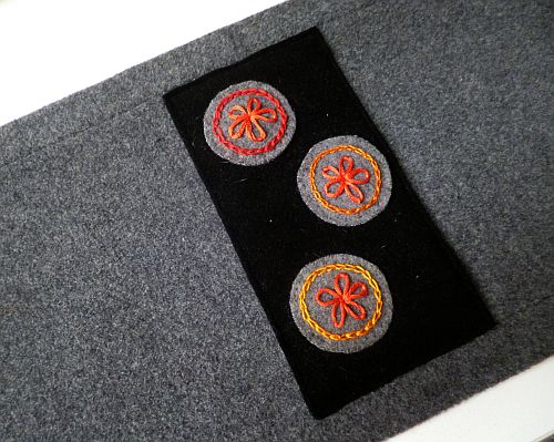 Jó, hát akkor kezdjük a gombbal megvarrni a kabátot: a molyrágcsa takarására kivágtam a fent is látható fekete téglalapot, rápakolgattam néhány tallért csak az esztétikus megjelenés végett,