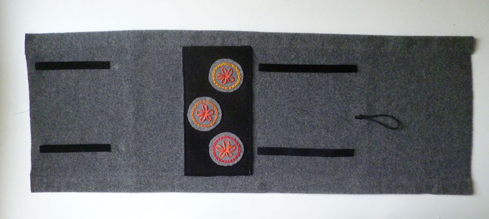 Szóval kivágván a teljes kindlitoknak szánt darabot a szürke szövetből (hosszúságra 4×hátlap szélessége + borítógerinc szélessége; a magasság már adott volt, éppen olyan széles volt ugyanis a sálféle izé, mint amilyenre nekem szükségem volt), elkezdtem spekulálni azon, hová varrjak rá gumiból mindenféle kis rögzítőket a céduláknak-tollnak-notesznek. Elég sokat kellett spekulálni, hogy hová, merre, milyen szélességben, hogyan néz majd ez ki összecsukva meg kinyitva meg mi légyen a praktikummal. Egy adott ponton így festett a jövendő tok: