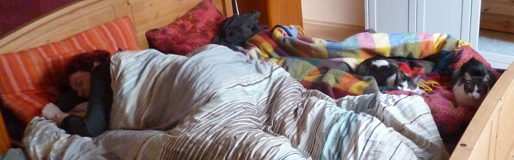 A családi inváziót a macskák viszonylag jól viselték (pl. egyik se hányt), de valószínűleg ma délelőtt lehettek a legviccesebbek, mikor én elkúsztam szundikálni, ők meg úgy döntöttek, hogy mellettem van a lakás legnyugisabb pontja.