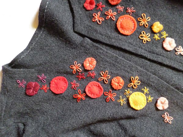 Egy mosásban összement gyapjúholmi egyetlen nagy előnyt nyújt, de az a jelen esetben jókora: nem kell tartani attól, hogy elfoszlik a vágott szél, össze van az már filcelődve becsülettel. Épp ezért nem is szegtem el a szabadon maradt széleket, csak elegyengettem őket.