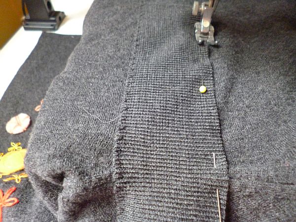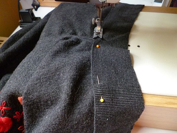 A passzét rágombostűztem a kardigán elejére (két rugalmas anyagnál nem lehet csak úgy uccuneki dolgozni, mert mindig ott a veszély, hogy elcsúszhatnak egymáson, aztán például az ujj eleje másfél centivel hosszabb lesz a hátuljánál),
