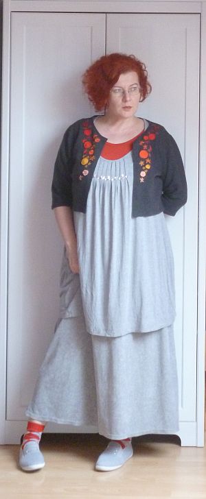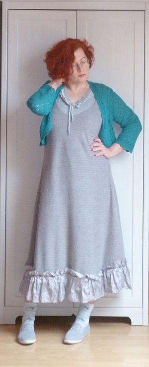 Ezt a darabot, amit most miszlikeltem fel, már éppen elegendő átalakítás ért életében, és még az is lehet, hogy nem ez volt az utolsó. Eredetileg így kezdte a karrierjét, aztán ezzel folytatta, majd lettek zsebei meg mindenféle dekorációi is, így ni. Utoljára több mint két évvel ezelőtt nyúltam hozzá, és az elmúlt évben már csak háziruhának hordtam, ideje volt kezdeni vele valamit, hogy visszakerüljön a forgalomba.