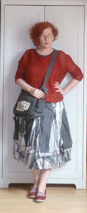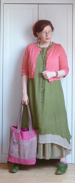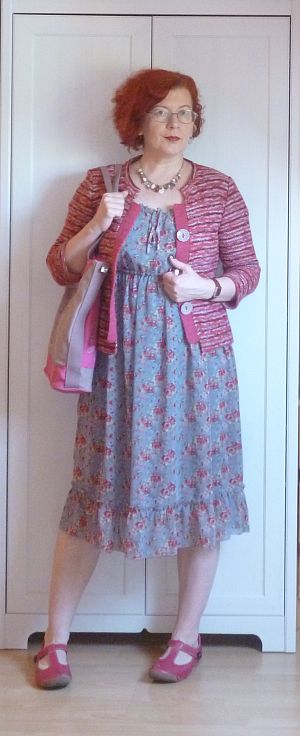 Ahhoz, hogy mégiscsak lehessen látni, én varrtam a cuccot, a nyakkivágást a szokott módon kivirágocskáztam, miután körbekajtattam a fél világot olyan coton perlé után, ami színében pont azonos a ruhaanyagéval.
