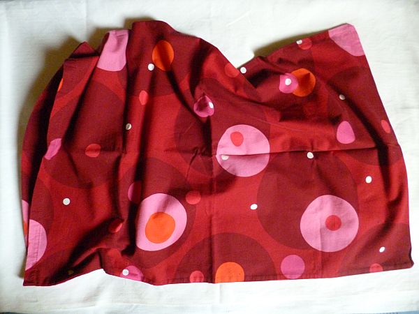 Jó tartású piros vászon vicces mintával, az elmosódott címke szerint ikeás darab és 100% pamut, háromszáz forintba került, és eleve alapanyagként vettem meg, nem pedig párnahuzatnak. (A párnaciháimat, bevallom, én jobb szeretem valami kevésbé durva anyagból. Egy bizonyos életkoron felül amúgy is kiapadhatatlan mulatságforrás ébredés után végigszemlézni az ember pofáján, milyen mintákat kreált rá éjjel a párna.) A turkálós párnahuzatok, legalábbis az én tapasztalataim szerint, pár centi pluszmínusz 75×45 vagy 80×80 centis méretekben érkeznek, a kisebbek záródás nélkül, a nagyobbak gyakran cipzárral. Ez itt speciel 75×48 centi, záródása nincs, a nyílásnál az egyik szél 18 centis visszahajtása fogja meg a párnát, hogy ne csusszanjon ki éjjeli forgolódás közben. A szabását (ez sem ritka ezeknél a turkálós huzatoknál) egyetlen folyamatos, hosszanti csíkból oldották meg. Ennélfogva a darab nettó anyagmérete 48×(75+75+18). Az épp elég sok. Tök vidáman ki lehetne hozni belőle egy topot vagy egy gyermekleánynak való pörgőszoknyát is, de most szatyrot varrunk, slussz.