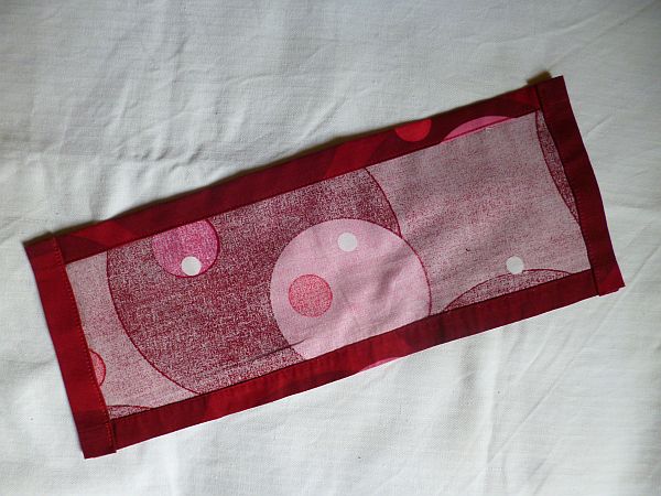 A pántok után megmaradt vékony anyagcsíkból egy leginkább madzaghoz hasonlatos tárgyat gyártottam, és speciel azt nem fotóztam le, de mindjárt meglátjátok. Most ugyanis visszatérünk a levágott visszahajtásra, 18×47 centi, egyik hosszanti oldalán szegéssel. A másik oldalán is beszegtem, aztán a két végén is.