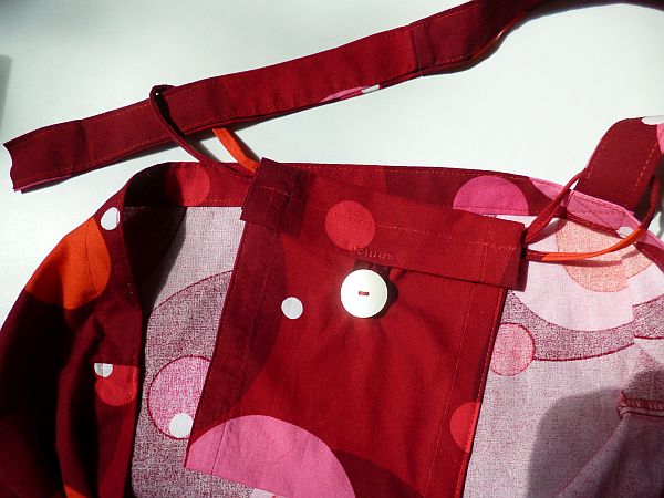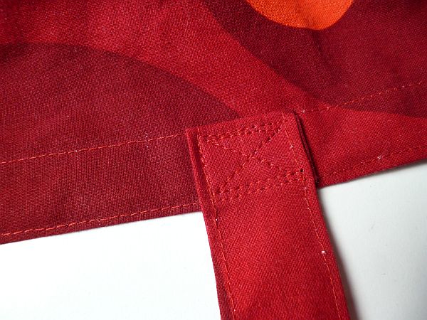 Az egyiket rögtön fel is varrtam a helyére. Erre nincs igazi recept azt leszámítva, hogy legyen tükörszimmetrikus a végeredmény; mindenkinek más igényei vannak arra, hol legyenek a szatyorfülek, és mennyire hosszú legyen a fogantyú. A felvarrást sem kell ennyire mívesre bütykölni, az senkinek se legyen irányadó, hogy alulírott kétszer visszahajtott széllel és a táskafüleknél szokásos András-kereszttel oldotta meg.
