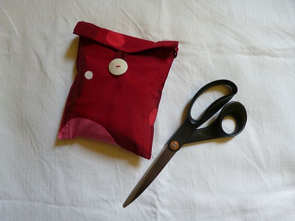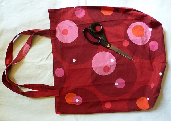 Az eredmény (az olló a méretarányok miatt van a képen) egy olyan jó nagy szatyor, aminek használat közben van belül egy kis szabadon fityegő zsebe,