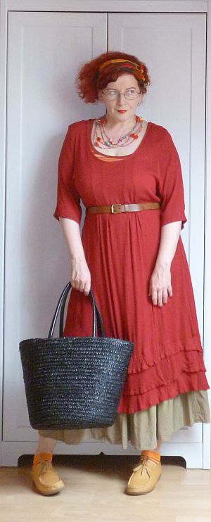Naszóval. Anyag ismerős, szabásminta ismerős, tegnap készült egy újabb-nagyobbított példány, ma használatba is lett véve. Úgyhogy most már tudjuk, ez a ruha kiválóan megfelel mindarra, mikor az ember lánya a Skanzenben