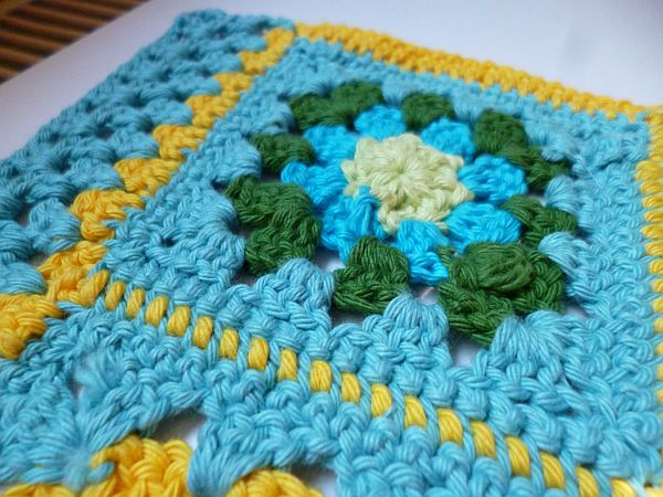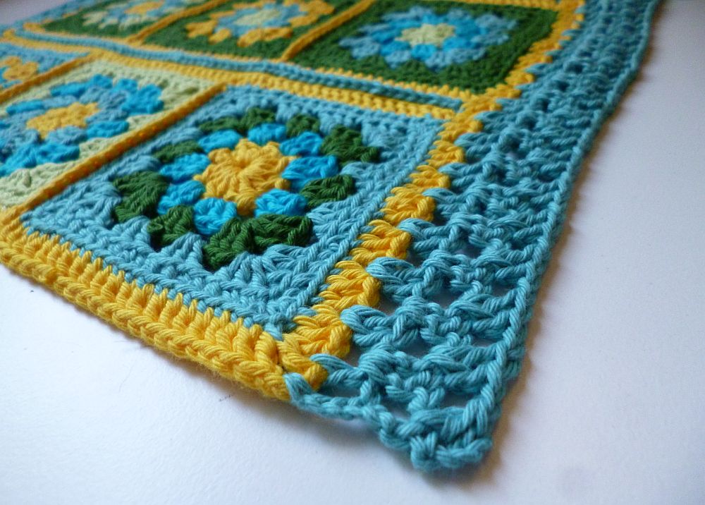 Az összeállítás előtt mindegyik nagyinégyzetet körbehorgoltam még egy-egy sor rövidpálcával, a sarkokon lévő két szemet egy-egy szemmel szaporítottam, közöttük meg egy levegőpálcával oldottam meg, hogy megmaradjon a négyzet-forma. Ez horgolni tudóknak biztos úgy hangzik, mint a babagagyogás, de – most már akár be is vallhatom – én sose tudtam horgolási recepteket olvasni és értelmezni. Múlt péntekig nem is volt a repertoáromban semmi, ami túlmutat a hatodikos kézimunkaórákon. Az a gyanúm, horgolásban is éppolyan autodidakta maradok, mint minden más bütykölőtevékenységben, és blogok, YouTube-videók meg kísérletezés révén fogok bármit is elsajátítani, aztán nem tudom elmagyarázni, hogyan csináltam.