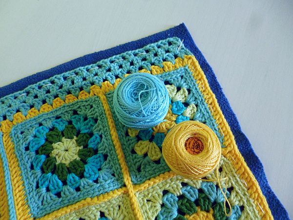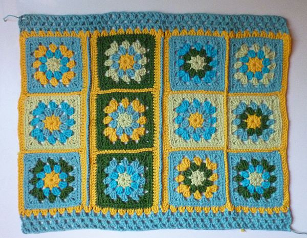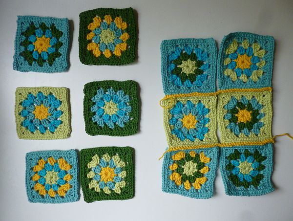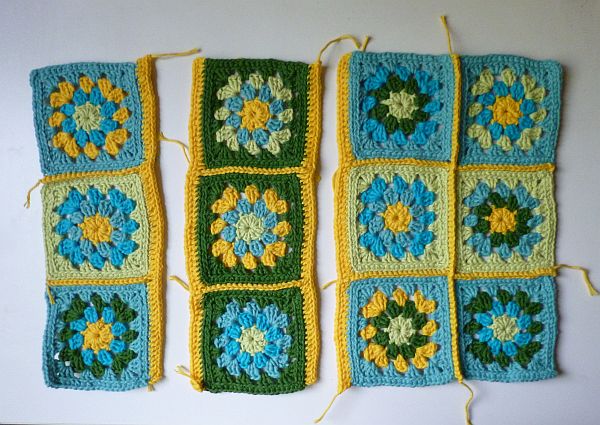 Ezúttal is. Meg vagyok győződve, hogy a nagyinégyzetek összeállítására kábé ötszáz módszer létezik, de én mentem a magam önfeje után, és azt csináltam, hogy a négyzeteket háttal egymásnak fordítottam, aztán összehorgoltam őket egy sor kontrasztos rövidpálcával.