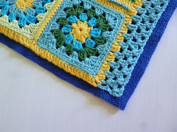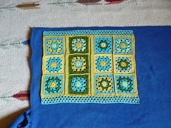 A kék cakkos szegély azért kellett, mert rengeteg eszemmel csak ekkor vettem elő a párnát, amire ezt rá óhajtám méretezni, és nyilván nem volt elég magas a háromsornyi nagyinégyzet. Hát akkor erisszük. A cakkokat is menet közben találtam ki, hogyan csináljam, és erre kifejezetten büszke vagyok.
