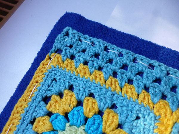 Végtelen örömmel varrtam volna fel géppel, de sajna az biztos girbegurba lett volna és csúf, meg egyébként is, ha már ennyit szoptam vele, hadd legyen tényleg szépen befejezve. Jövel, kézzel eldolgozás. Előbb ráférceltem a horgolt lapot a polárlapra, így,