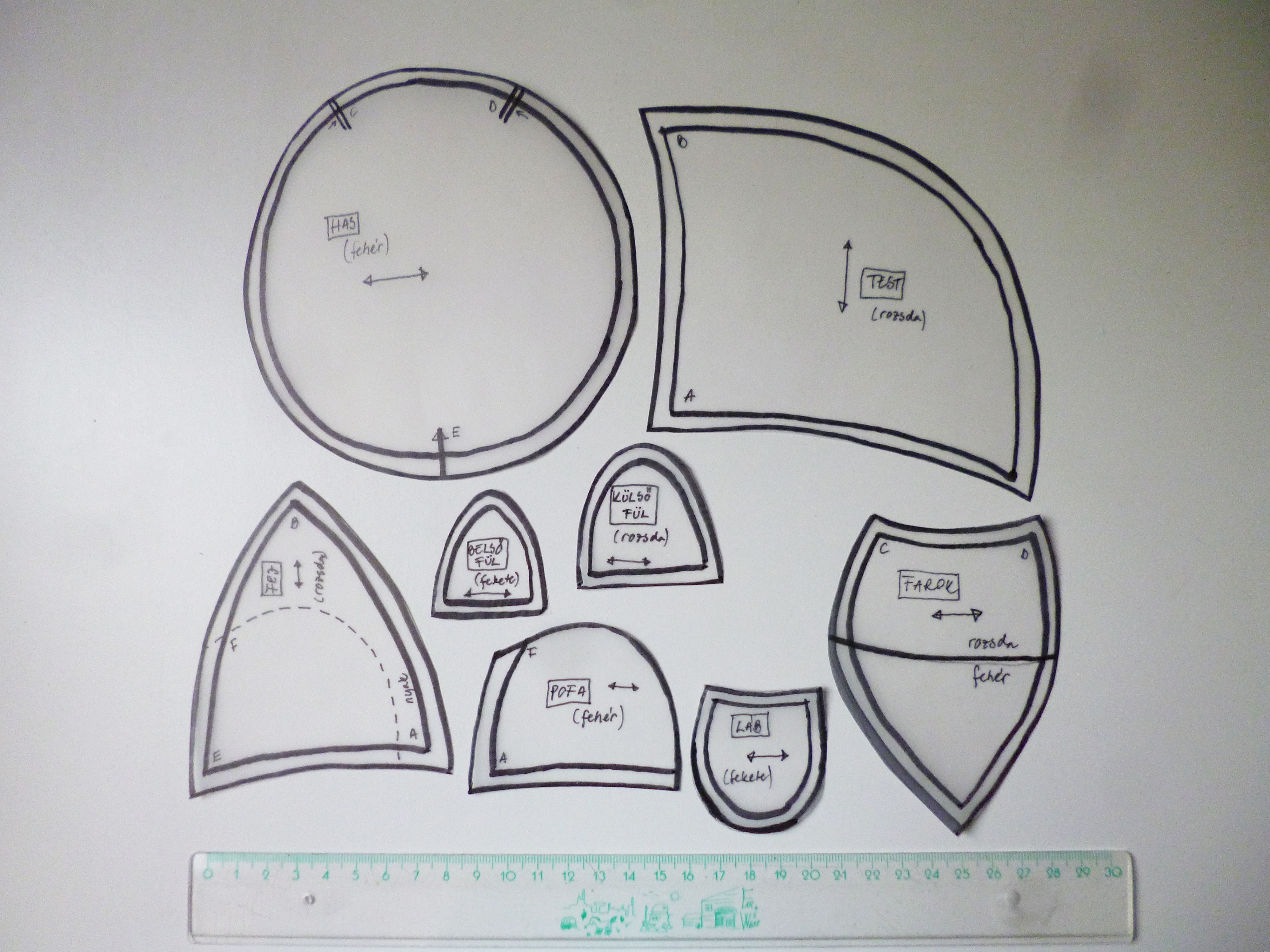 Mindenekelőtt: itt vannak a darabok, amelyekből csináltam, varrásráhagyással együtt ábrázolva. (A kép kattintásra megnő, a lehető legnagyobbra, amit csinálni tudtam.)