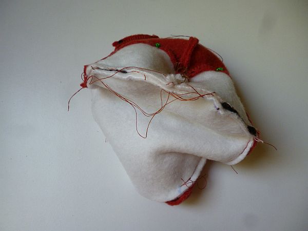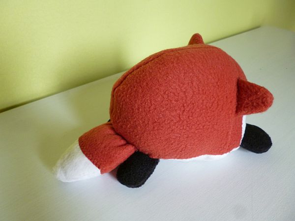 Azon a nyíláson keresztül fordítottam ki a bucit, aztán szintén azon a nyíláson a két hátsó lábat rávarrtam a hasrészre. Erre most jó lenne egy fotó, de nincs. Olyasformán tessék elképzelni, mint az első lábak felvarrását, de nem a róka felső, hanem alsó részére kell hogy kerüljön. Felülre ugyanis a farok kerül. Ez: