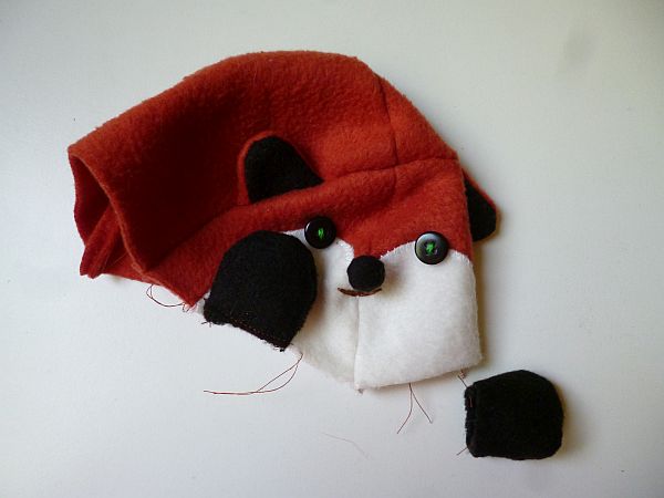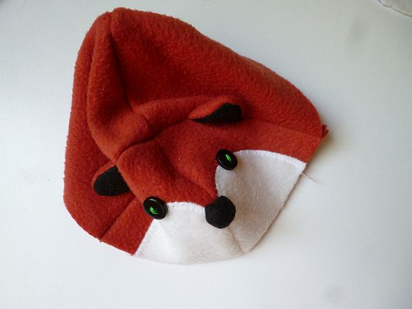 Rozsdaszínű cérnával összevarrtam a fej két darabját, összevarrtam a test két darabját is, aztán elkészítettem a mosómaci receptje alapján a füleket, és szintén annak a receptje alapján beillesztettem a test meg a fej darabja közé, és színt színre fordítva összevarrtam az egészet. A számomra szimpatikus helyre felvarrtam zöld hímzőcérnával a kis fekete gombszemeket, majd szintén a mosómaci receptjének megfelelően elkészítettem kis fekete polárköröcskéből az orrot, és felvarrtam arra a pontra, ahol a fej rozsdaszínű része csúcsba fut össze.