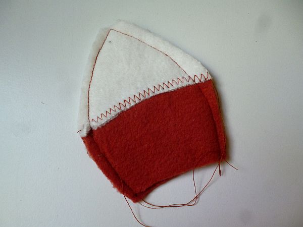 A rókához előbb a fehér pofarészeket varrtam fel fehér cérnával, cikcakkal a rozsdaszínű fejrészekre, majd a fehér alól kivágtam a varrásvonal mellett a rozsdaszínű anyagot, így: