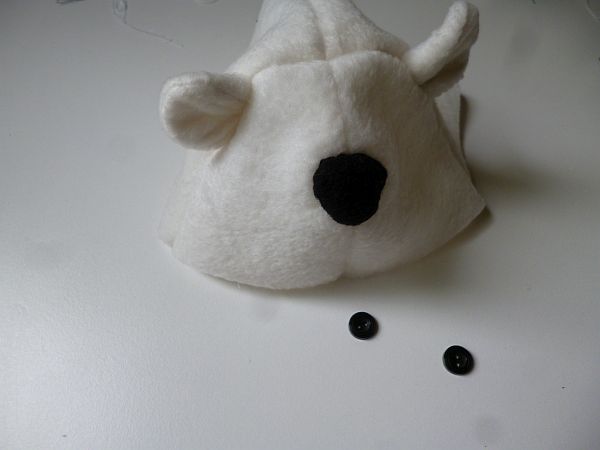 Az orrot ezúttal háromszög formájúra és nagyobbra formáltam – ne kérdezzétek meg, hogyan, mert nem tudom elmondani. Kézbe vettem egy kétujjnyi formátlan fekete polárdarabot, aztán addig hajtogattam-varrogattam, amíg ilyen lett.