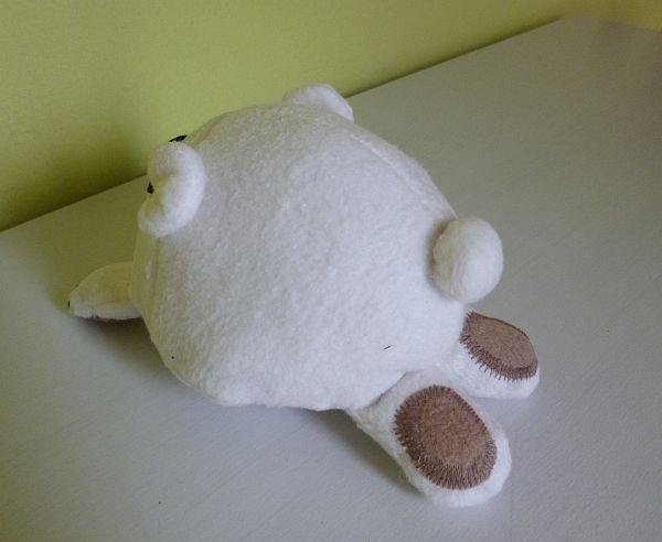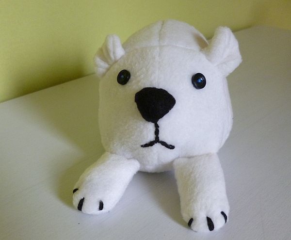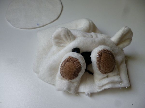 A róka sablonjához képest annyi különbség van, hogy a füleket meg lábakat szélesebbre szabtam, mint a rókánál, a fejre meg nem szabtam ki külön pofarészt. A lábakat tappanccsal láttam el, az első kettőre hímzőcérnával karmokat is varrtam (már az összeállítás és kitömés után),