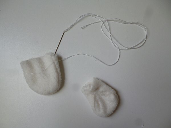 A szemeket kék hímzőcérnával varrtam fel, a lábakat pedig úgy, hogy az elsőket a tappancsokkal lefelé rögzítettem, a hátsókat meg tappanccsal felfelé (ehhez az utóbbihoz görgessetek le az utolsó képhez).