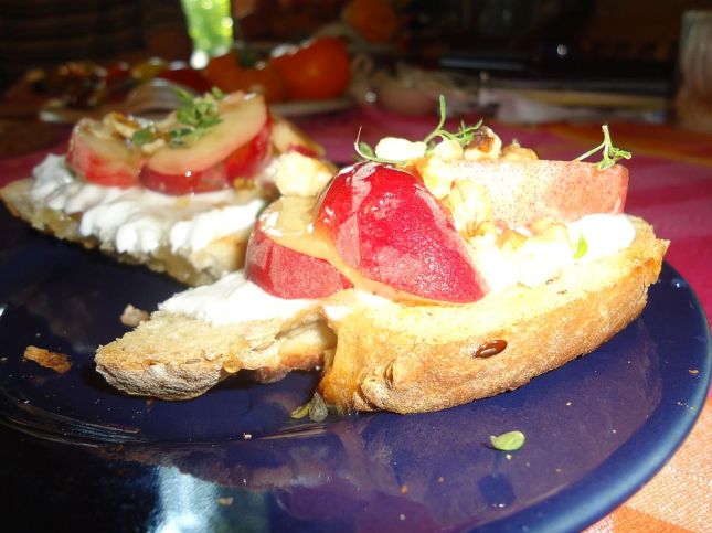 3. A “nagyon érdekes” reggeli. (Pirítós zöldfűszeres kecskesajtkrémmel, barackkal, dióval, mézzel és citromos kakukkfűvel).