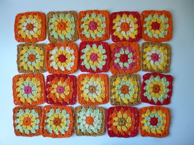 Ezúttal is. Meg vagyok győződve, hogy a nagyinégyzetek összeállítására kábé ötszáz módszer létezik, de én mentem a magam önfeje után, és azt csináltam, hogy a négyzeteket háttal egymásnak fordítottam, aztán összehorgoltam őket egy sor kontrasztos rövidpálcával.